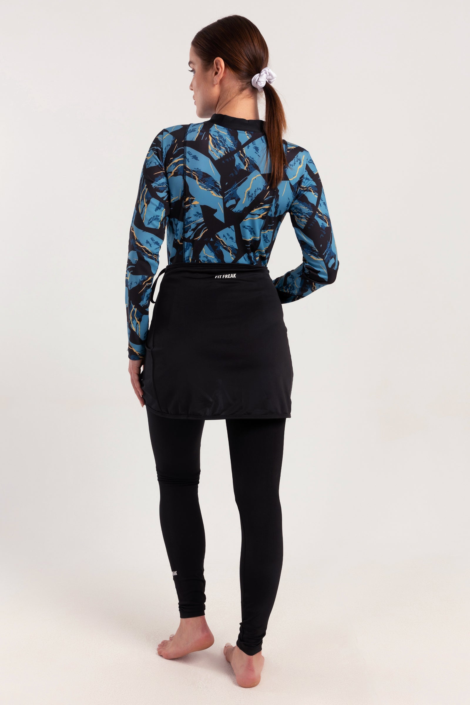 This 4-piece burkini set features a bold, artistic print top with a high neck and front zipper for easy wear and sleek coverage. The set includes a pants, a hip cover for added modesty and a swim cap�???designed for both standout style and active comfort at the beach or pool.