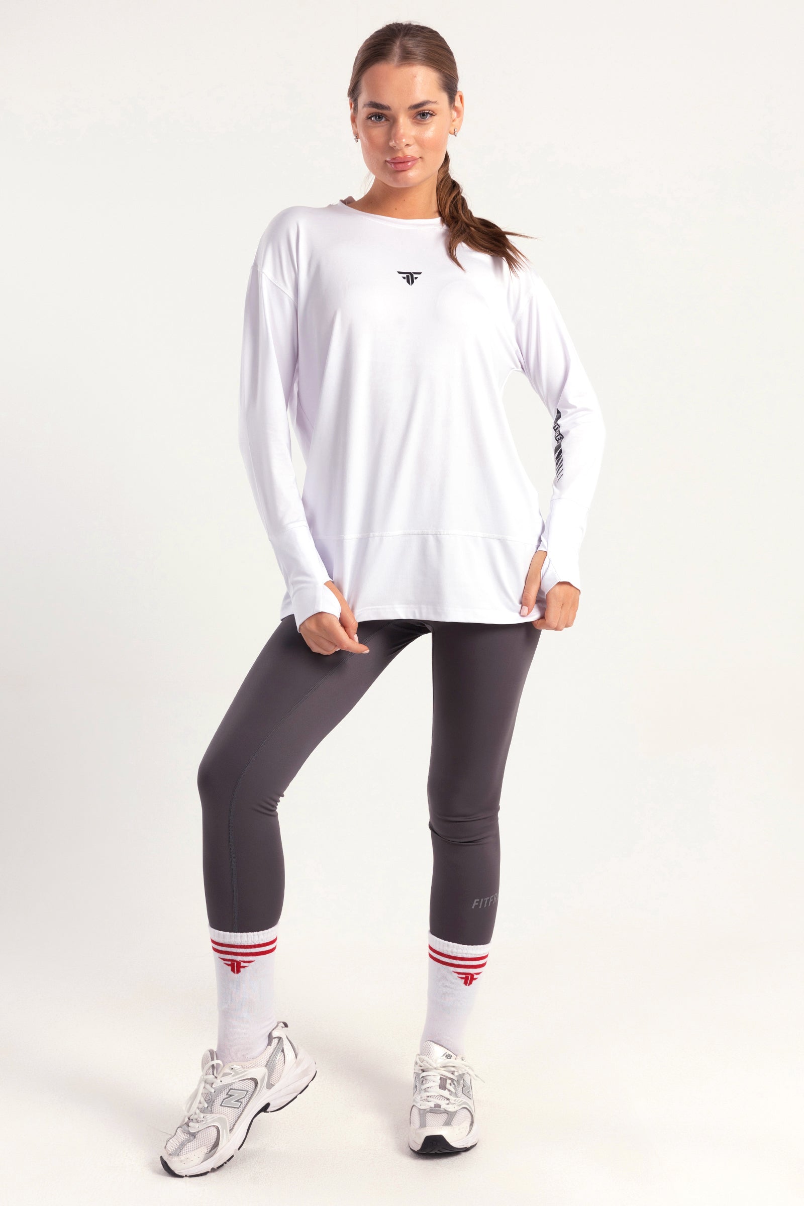The warm-up regular fit??? top features a round collar and thumpholes.