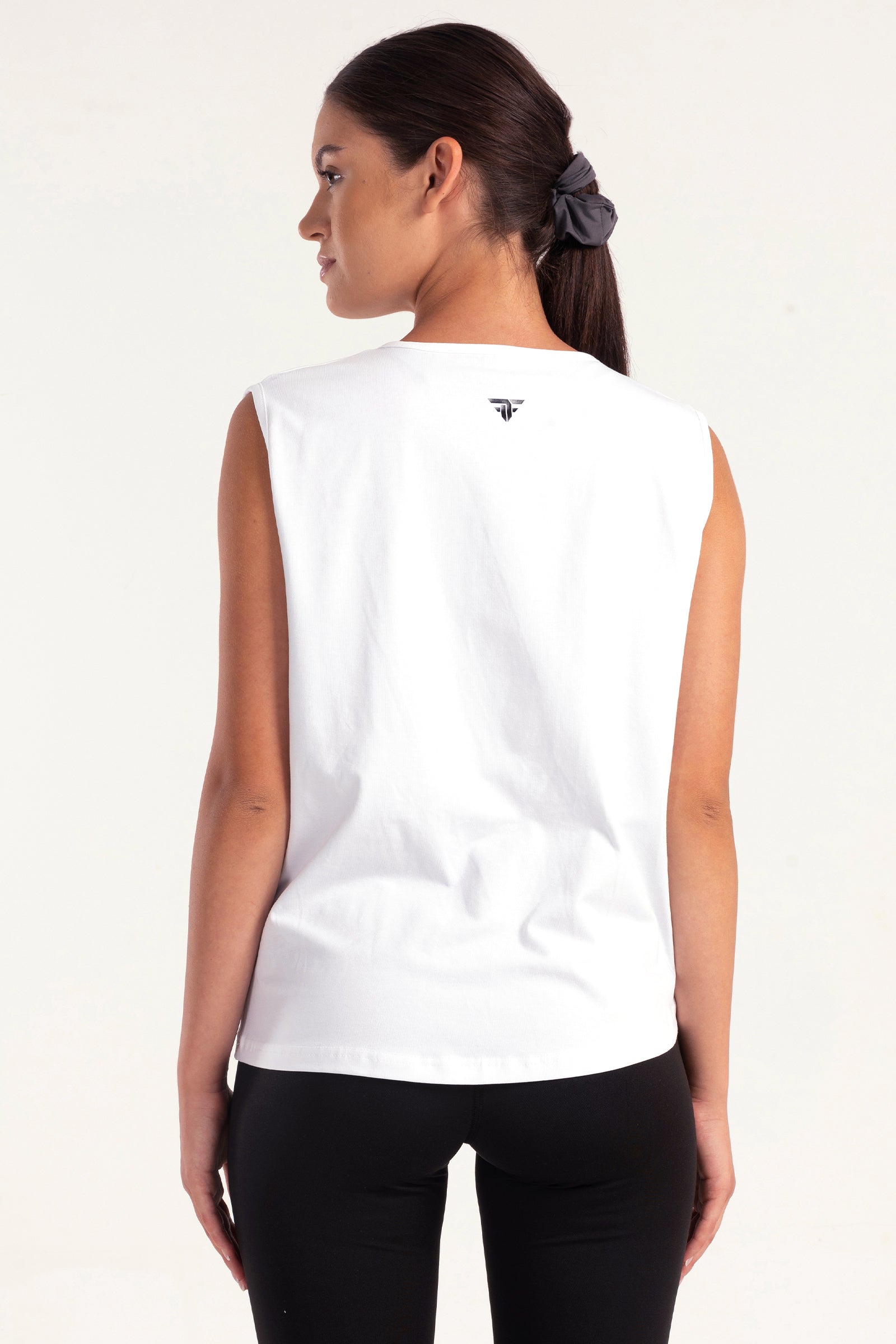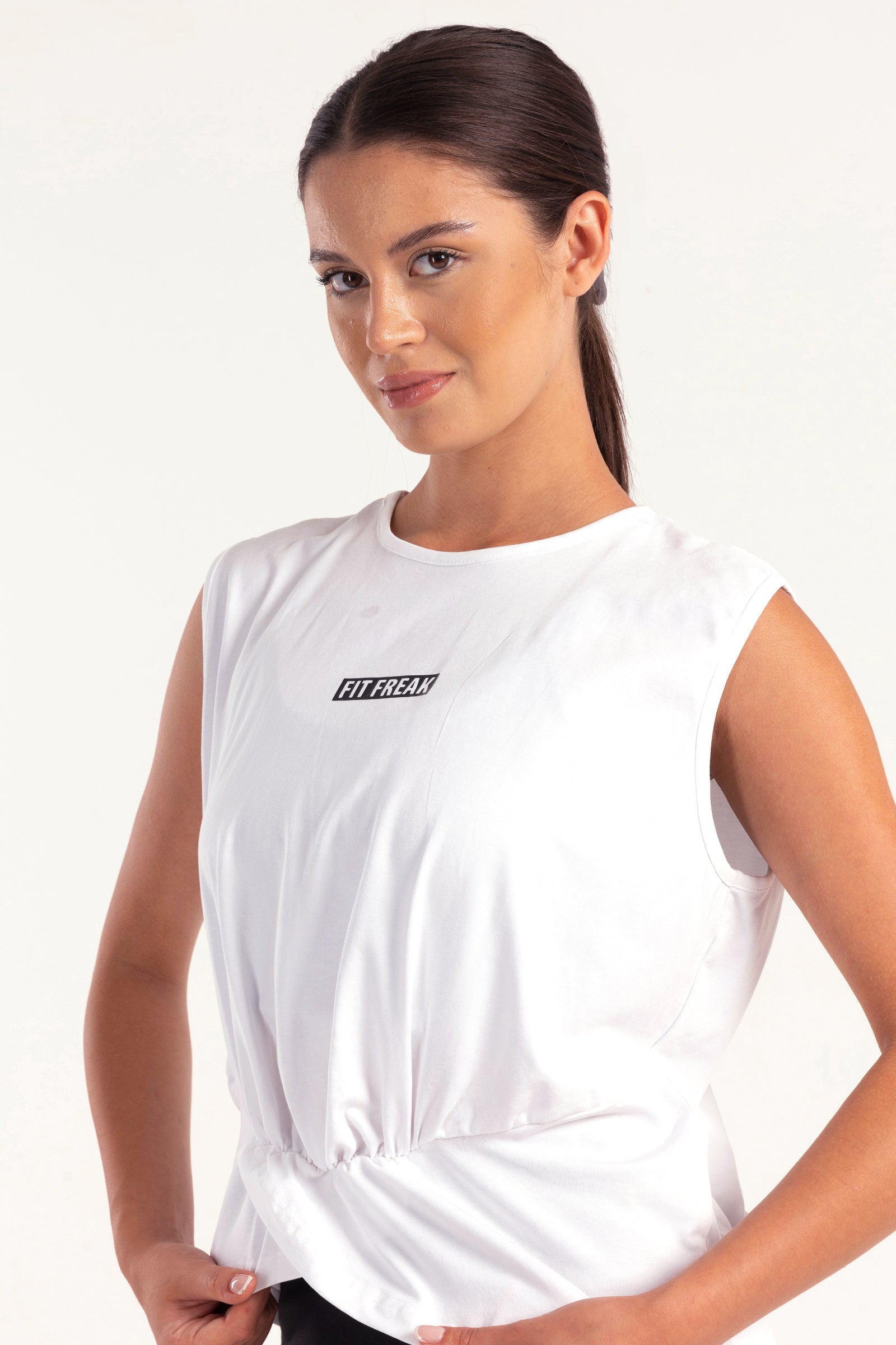 Lightweight sleeveless tank top with a twist-front detail and chest logo print perfect for training or layering.